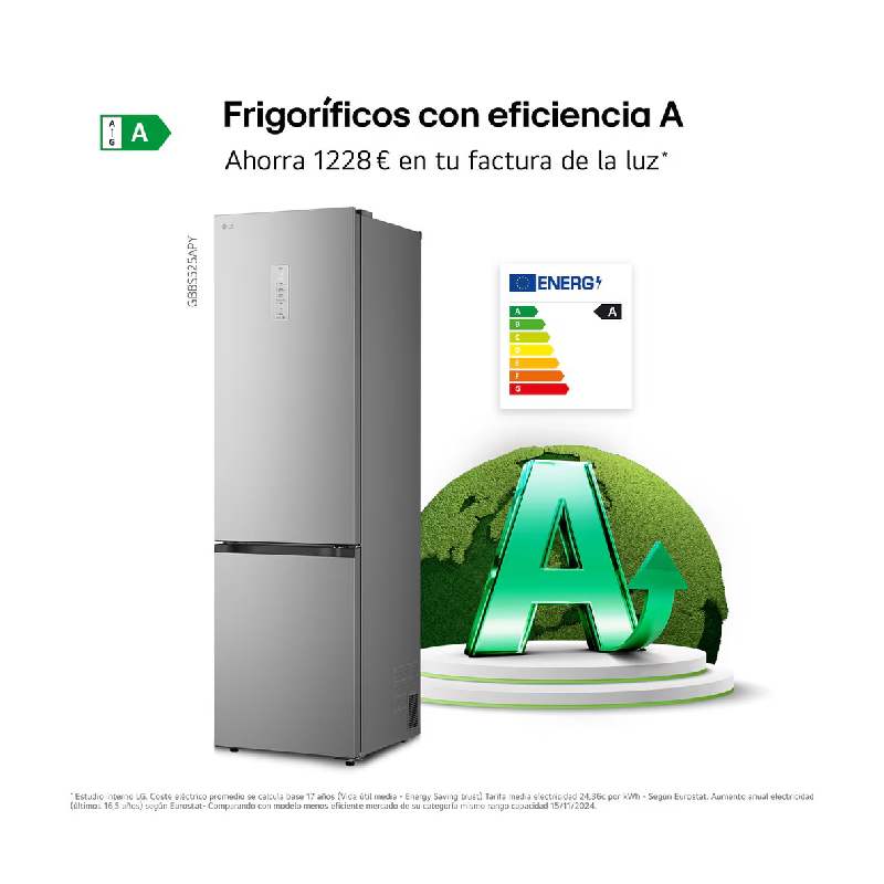 El LG GBBS525APY es un frigorífico combi de 203 cm de altura con acabado en acero inoxidable MetalFresh, diseñado para ofrecer máxima conservación, eficiencia energética A y un funcionamiento ultrasilencioso de solo 29 dB. Incorpora las tecnologías más avanzadas de LG para mantener los alimentos frescos durante más tiempo.